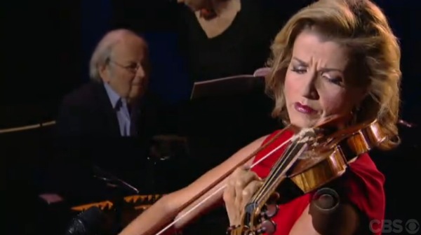 Anne-Sophie Mutter recently stopped by CBS’s “The Late Show with David Letterman” to perform a selection from her new album collection — “ASM 35”, a compilation of music celebrating her 35 years as a violinist. Mutter was joined by her ex-husband André Previn, who accompanied her on the piano. Letterman had some trouble handling the large plastic casing for the album, joking that it would make an ideal home for a hamster. Following her performance, Mutter asked Letterman if he had a hamster at home, to which the comedian responded that he will get one. [Source]